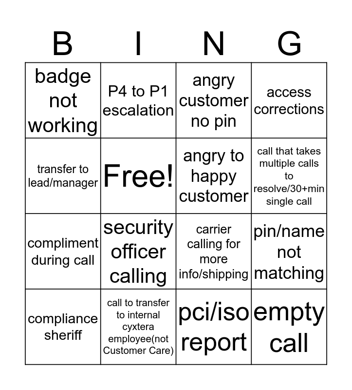 This bingo card has 17 words: pci/iso report, compliance sheriff, angry customer no pin, badge not working, security officer calling, access corrections, pin/name not matching, angry to happy customer, call that takes multiple calls to resolve/30+min single call, Free!, call to transfer to internal cyxtera employee(not Customer Care), carrier calling for more info/shipping, transfer to lead/manager, P4 to P1 escalation, compliment during call, customer needs portal training and empty call.