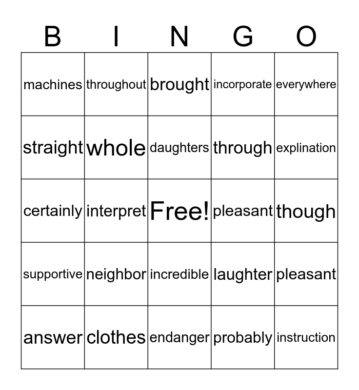 This bingo card has a free space and 24 words: neighbor, clothes, daughters, answer, everywhere, machines, straight, throughout, pleasant, incredible, through, certainly, laughter, pleasant, whole, probably, though, brought, explination, interpret, instruction, supportive, incorporate and endanger.