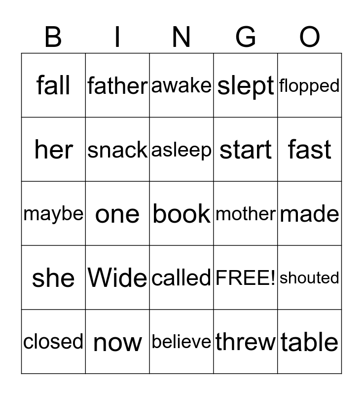 This bingo card has 25 words: Wide, believe, asleep, closed, flopped, fall, her, father, mother, called, start, maybe, FREE!, shouted, snack, table, made, awake, fast, one, book, now, she, slept and threw.