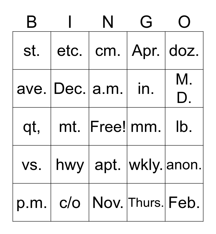 This bingo card has a free space and 24 words: hwy, c/o, a.m., p.m., doz., st., ave., etc., mm., apt., in., qt,, wkly., anon., Dec., Thurs., lb., cm., M. D., mt., Feb., vs., Apr. and Nov..