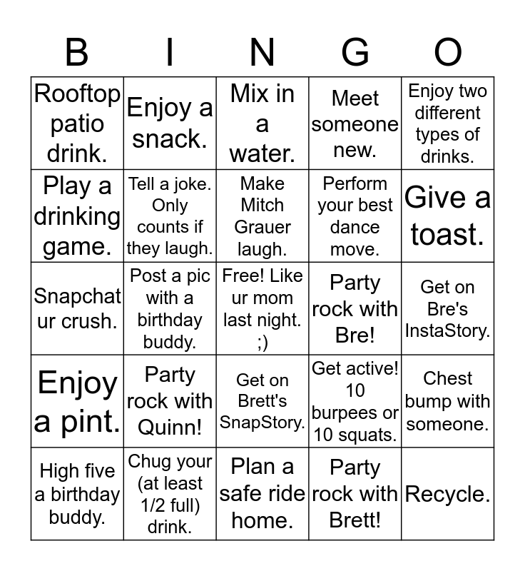 This bingo card has a free space and 24 words: Party rock with Quinn!, Chug your (at least 1/2 full) drink., Make Mitch Grauer laugh., High five a birthday buddy., Enjoy two different types of drinks., Rooftop patio drink., Play a drinking game., Enjoy a snack., Party rock with Bre!, Get on Brett's SnapStory., Perform your best dance move., Snapchat ur crush., Get active! 10 burpees or 10 squats., Chest bump with someone., Tell a joke. Only counts if they laugh., Party rock with Brett!, Get on Bre's InstaStory., Mix in a water., Give a toast., Post a pic with a birthday buddy., Recycle., Enjoy a pint., Meet someone new. and Plan a safe ride home..