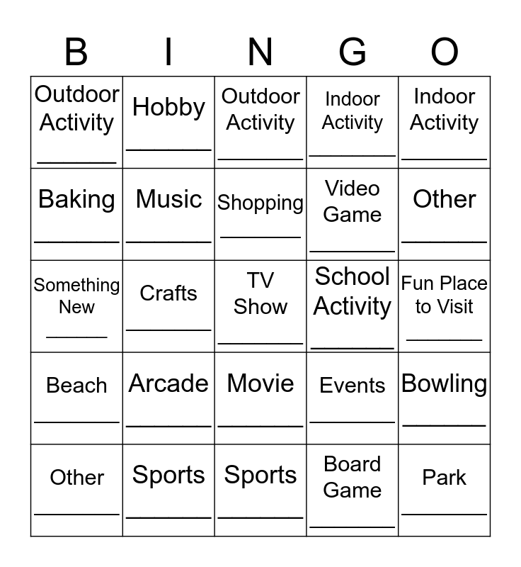 This bingo card has a free space and 24 words: Arcade ______, Sports ______, Shopping _______, Other _______, Indoor Activity _______, Outdoor Activity ______, Baking ______, Hobby ______, School Activity ______, Movie ______, Video Game _______, Something New ______, Events _______, Bowling ______, Music ______, Board Game _______, Fun Place to Visit _______, Outdoor Activity _______, Other ______, Crafts _______, Park _______, Beach _______, Indoor Activity ________ and Sports ______.