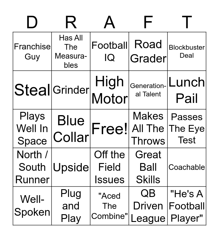 This bingo card has a free space and 24 words: Upside, Plug and Play, High Motor, Well-Spoken, Blockbuster Deal, Franchise Guy, Steal, Has All The Measura-bles, Makes All The Throws, Off the Field Issues, Generation-al Talent, Plays Well In Space, Great Ball Skills, Coachable, Grinder, QB Driven League, Passes The Eye Test, Football IQ, Lunch Pail, Blue Collar, "He's A Football Player", North / South Runner, Road Grader and "Aced The Combine".