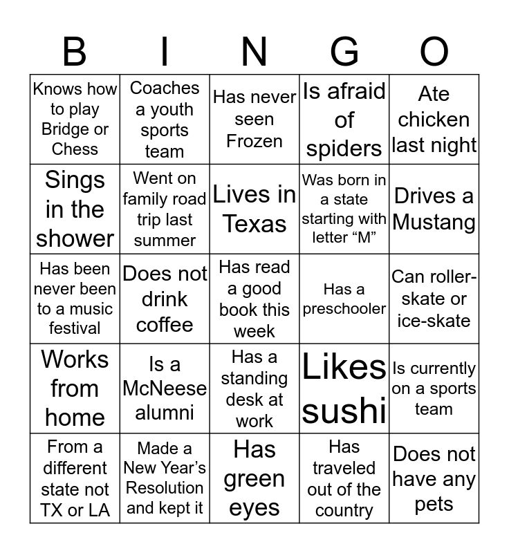 This bingo card has 25 words: Is a McNeese alumni, Has green eyes, Lives in Texas, From a different state not TX or LA, Ate chicken last night, Knows how to play Bridge or Chess, Sings in the shower, Coaches a youth sports team, Has a preschooler, Has a standing desk at work, Was born in a state starting with letter “M”, Has been never been to a music festival, Likes sushi, Is currently on a sports team, Went on family road trip last summer, Does not have any pets, Can roller-skate or ice-skate, Has never seen Frozen, Drives a Mustang, Does not drink coffee, Has read a good book this week, Made a New Year’s Resolution and kept it, Works from home, Is afraid of spiders and Has traveled out of the country.