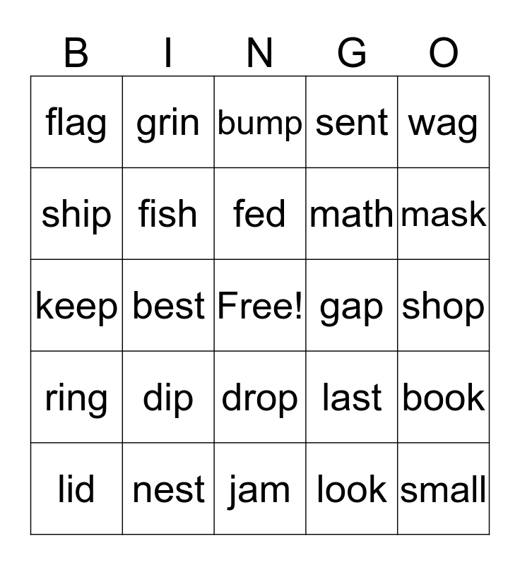 This bingo card has a free space and 25 words: dip, jam, fed, lid, wag, flag, ship, grin, gap, drop, math, keep, last, book, fish, chip, shop, bump, mask, best, small, nest, ring, sent and look.