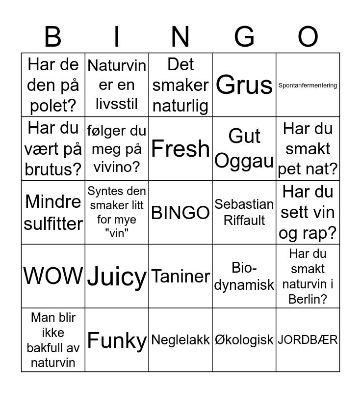 This bingo card has a free space and 24 words: Juicy, Funky, Fresh, Man blir ikke bakfull av naturvin, Spontanfermentering, Har de den på polet?, Har du vært på brutus?, Naturvin er en livsstil, Sebastian Riffault, Taniner, Gut Oggau, Mindre sulfitter, Bio-dynamisk, Har du smakt naturvin i Berlin?, følger du meg på vivino?, Økologisk, Har du sett vin og rap?, Det smaker naturlig, Har du smakt pet nat?, Syntes den smaker litt for mye "vin", JORDBÆR, WOW, Grus and Neglelakk.