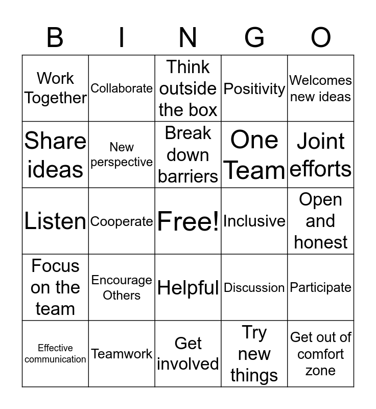 This bingo card has a free space and 24 words: Encourage Others, Teamwork, Break down barriers, Effective communication, Welcomes new ideas, Work Together, Share ideas, Collaborate, Inclusive, Helpful, One Team, Listen, Discussion, Participate, New perspective, Try new things, Open and honest, Think outside the box, Joint efforts, Cooperate, Get out of comfort zone, Focus on the team, Positivity and Get involved.