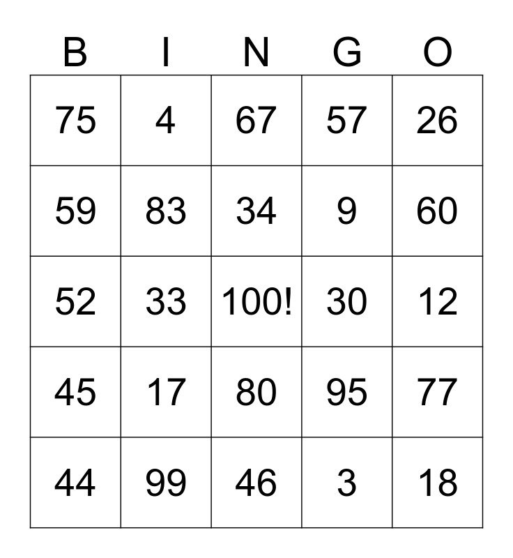 This bingo card has a free space and 24 words: 17, 99, 34, 44, 26, 75, 59, 4, 30, 80, 9, 52, 95, 77, 83, 3, 12, 67, 60, 33, 18, 45, 57 and 46.