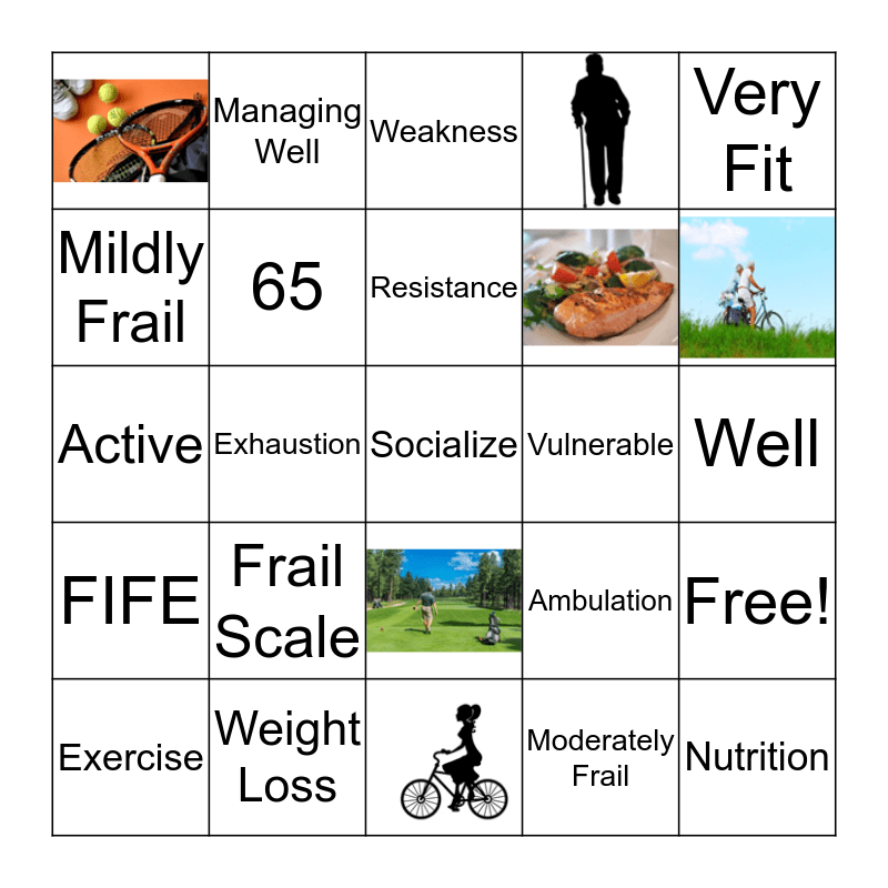 This bingo card has 7 images and 19 words: Moderately Frail, Resistance, Weight Loss, Very Fit, Mildly Frail, Managing Well, Well, Ambulation, Active, Free!, Exercise, Exhaustion, FIFE, Weakness, Socialize, Vulnerable, Frail Scale, 65 and Nutrition.
