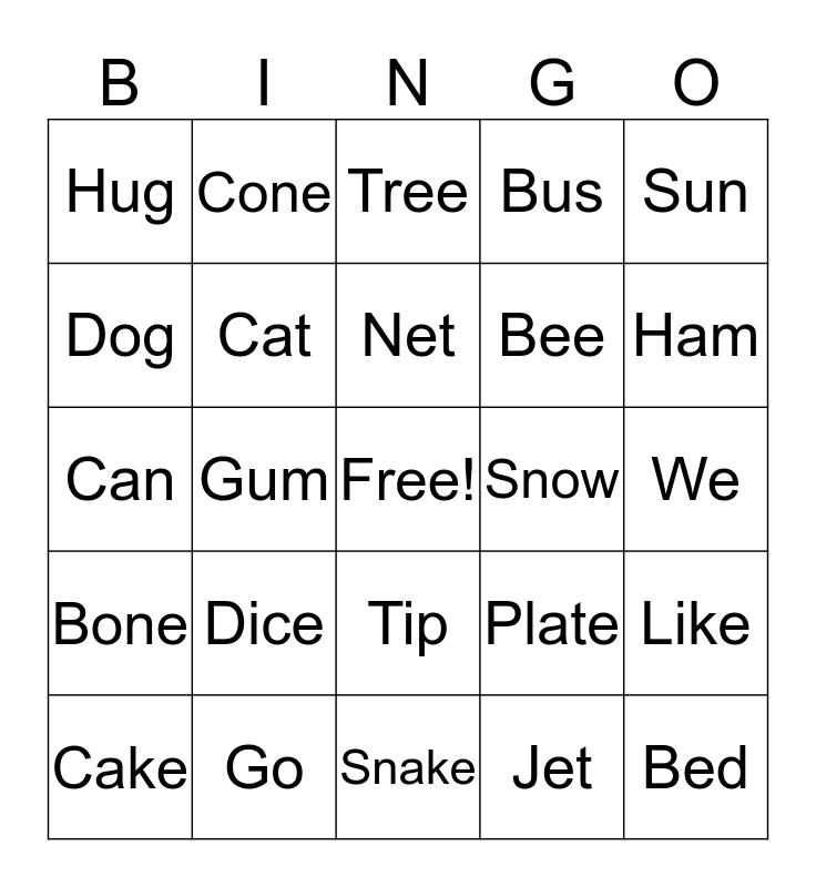 This bingo card has a free space and 24 words: Dice, Go, Net, Cake, Sun, Hug, Dog, Cone, Snow, Tip, Bee, Can, Plate, Like, Cat, Jet, We, Tree, Ham, Gum, Bed, Bone, Bus and Snake.