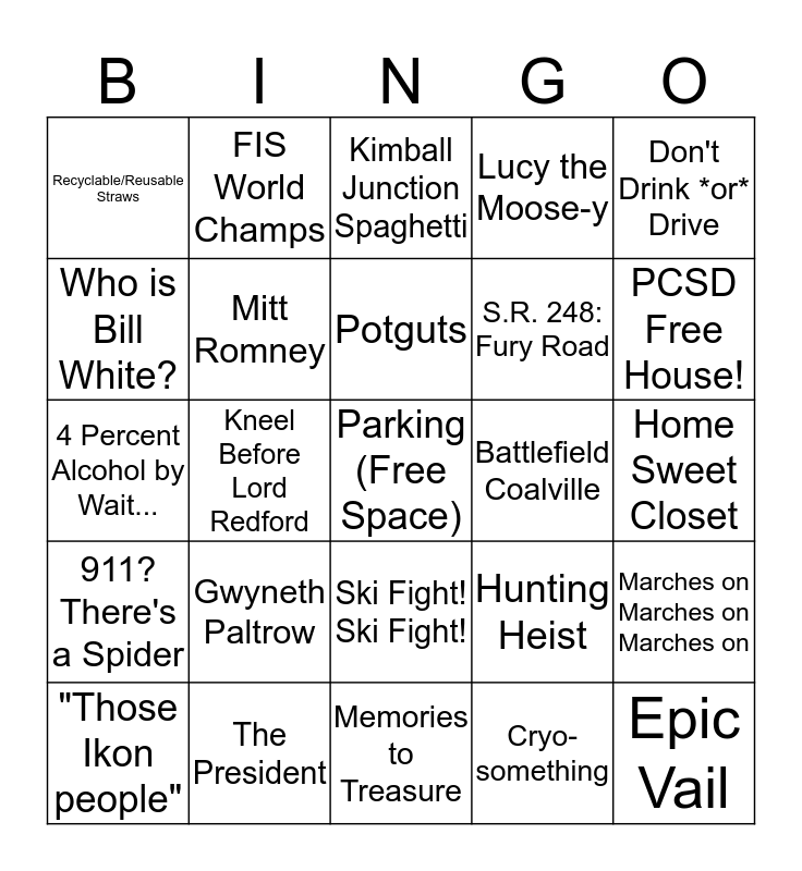 This bingo card has a free space and 29 words: "Those Ikon people", Kilby Road Slalom Course, Kneel Before Lord Redford, Cows? In My Alpine Paradise?, Recyclable/Reusable Straws, Kimball Junction Spaghetti, Mitt Romney, Gwyneth Paltrow, Battlefield Coalville, The President, Home Sweet Closet, Epic Vail, Memories to Treasure, Cryo-something, PCSD Free House!, Bear Spray, Ski Fight! Ski Fight!, 911? There's a Spider, Don't Drink *or* Drive, 4 Percent Alcohol by Wait..., Hunting Heist, Doing the Olympics' Bidding, S.R. 248: Fury Road, Who is Bill White?, Lucy the Moose-y, FIS World Champs, Marches on Marches on Marches on, Potguts and Thank God for Colorado.