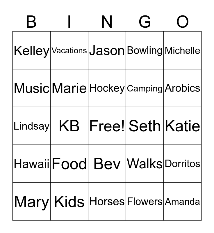 This bingo card has a free space and 29 words: Mary, Lisa, KB, Tracey, Kelley, Jason, Marie, Food, Seth, Kids, Katie, Amanda, Horses, Flowers, Arobics, Cows, Bev, Hawaii, Michelle, Lindsay, Walks, Derrick, Camping, Music, Bowling, Vacations, Dorritos, Hockey and Babies.