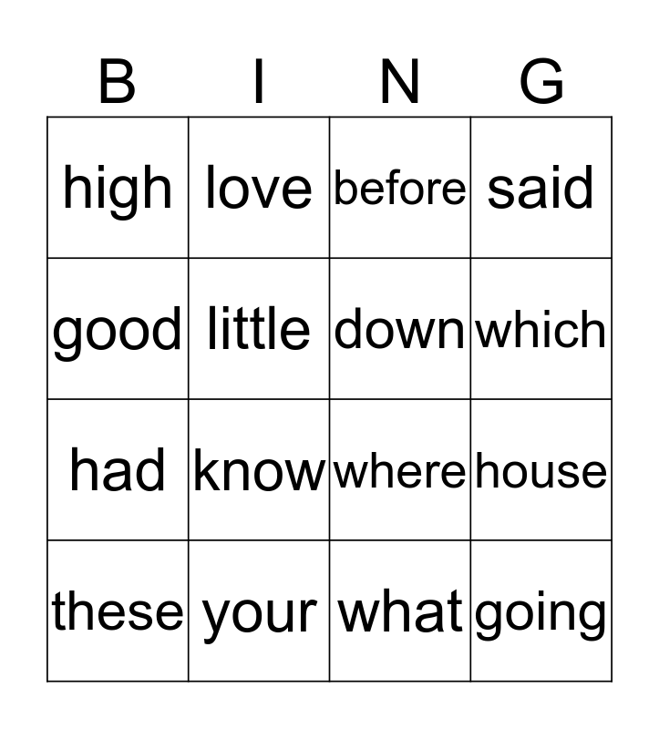 This bingo card has 16 words: your, house, before, high, had, love, where, what, good, little, these, said, know, which, down and going.