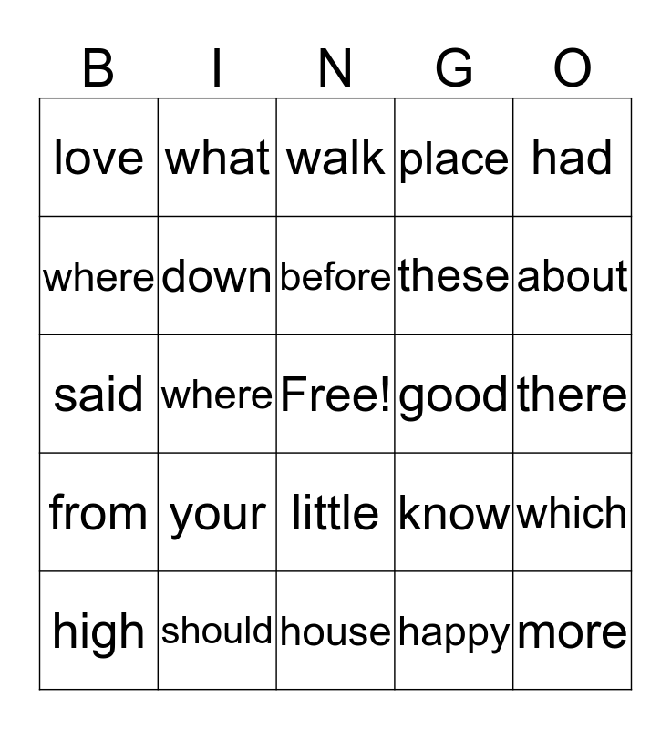 This bingo card has a free space and 25 words: your, house, before, high, had, love, where, what, good, little, these, said, know, which, down, going, there, walk, about, where, more, should, from, place and happy.