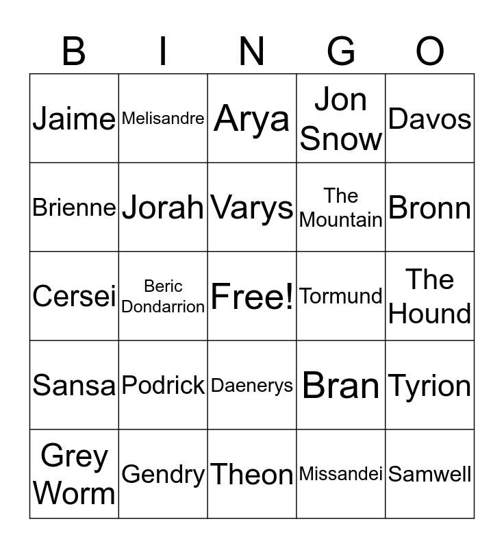 This bingo card has a free space and 24 words: Podrick, Gendry, Varys, Grey Worm, Davos, Jaime, Brienne, Melisandre, Tormund, Daenerys, The Mountain, Cersei, Bran, Tyrion, Jorah, Missandei, The Hound, Arya, Bronn, Beric Dondarrion, Samwell, Sansa, Jon Snow and Theon.