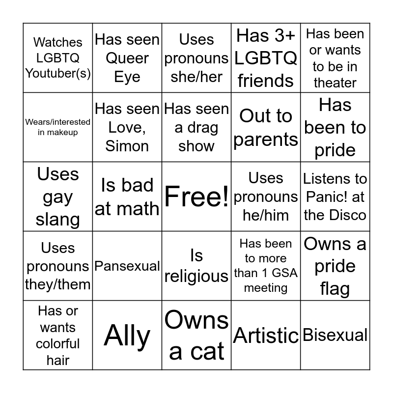 This bingo card has a free space and 24 words: Pansexual, Ally, Has seen a drag show, Has or wants colorful hair, Has been or wants to be in theater, Watches LGBTQ Youtuber(s), Wears/interested in makeup, Has seen Queer Eye, Uses pronouns he/him, Is religious, Out to parents, Uses gay slang, Has been to more than 1 GSA meeting, Owns a pride flag, Has seen Love, Simon, Artistic, Listens to Panic! at the Disco, Uses pronouns she/her, Has been to pride, Is bad at math, Bisexual, Uses pronouns they/them, Has 3+ LGBTQ friends and Owns a cat.