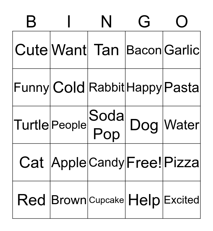 This bingo card has 25 words: Apple, Cupcake, Rabbit, Red, Garlic, Cute, Funny, Want, Dog, Candy, Happy, Turtle, Free!, Pizza, Cold, Excited, Water, Tan, Pasta, People, Soda Pop, Brown, Cat, Bacon and Help.