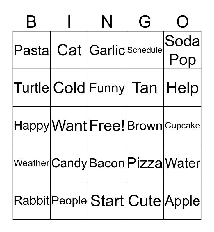 This bingo card has a free space and 24 words: Candy, People, Funny, Rabbit, Soda Pop, Pasta, Turtle, Cat, Brown, Bacon, Tan, Happy, Pizza, Water, Cold, Cute, Cupcake, Garlic, Help, Want, Apple, Weather, Schedule and Start.