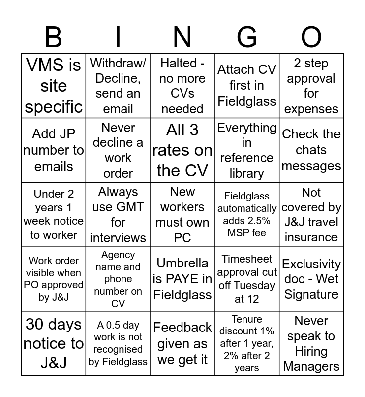 This bingo card has a free space and 24 words: Agency name and phone number on CV, A 0.5 day work is not recognised by Fieldglass, All 3 rates on the CV, 30 days notice to J&J, 2 step approval for expenses, VMS is site specific, Add JP number to emails, Withdraw/ Decline, send an email, Fieldglass automatically adds 2.5% MSP fee, Umbrella is PAYE in Fieldglass, Everything in reference library, Under 2 years 1 week notice to worker, Timesheet approval cut off Tuesday at 12, Exclusivity doc - Wet Signature, Never decline a work order, Tenure discount 1% after 1 year, 2% after 2 years, Not covered by J&J travel insurance, Halted - no more CVs needed, Check the chats messages, Always use GMT for interviews, Never speak to Hiring Managers, Work order visible when PO approved by J&J, Attach CV first in Fieldglass and Feedback given as we get it.