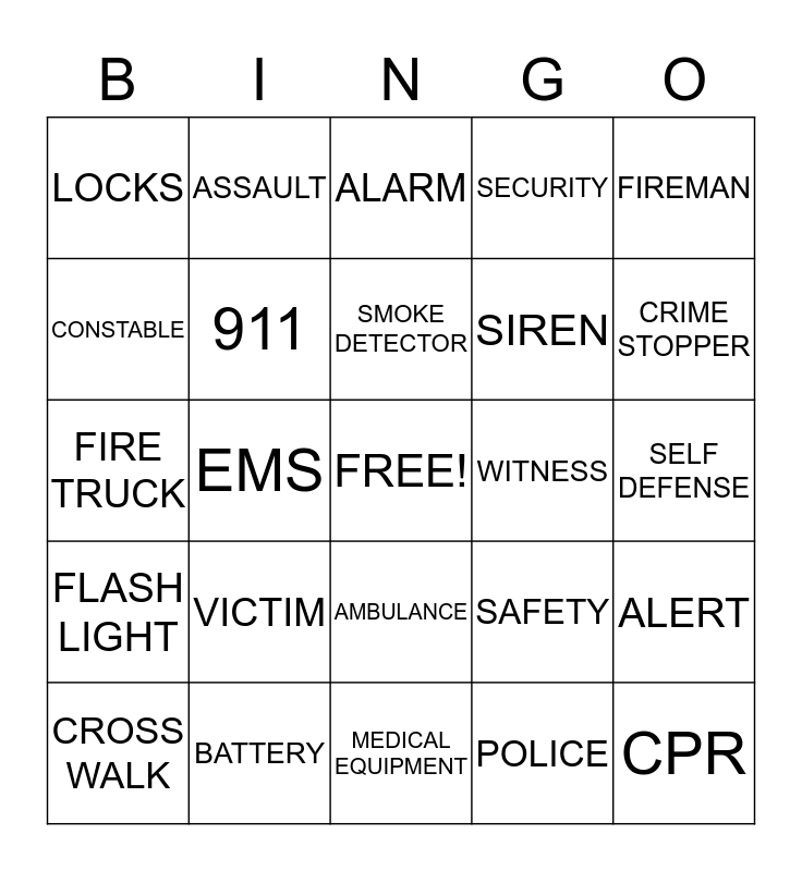 This bingo card has a free space and 24 words: VICTIM, BATTERY, SMOKE DETECTOR, CROSS WALK, FIREMAN, LOCKS, CONSTABLE, ASSAULT, WITNESS, AMBULANCE, SIREN, FIRE TRUCK, SAFETY, ALERT, 911, POLICE, SELF DEFENSE, ALARM, CRIME STOPPER, EMS, CPR, FLASH LIGHT, SECURITY and MEDICAL EQUIPMENT.