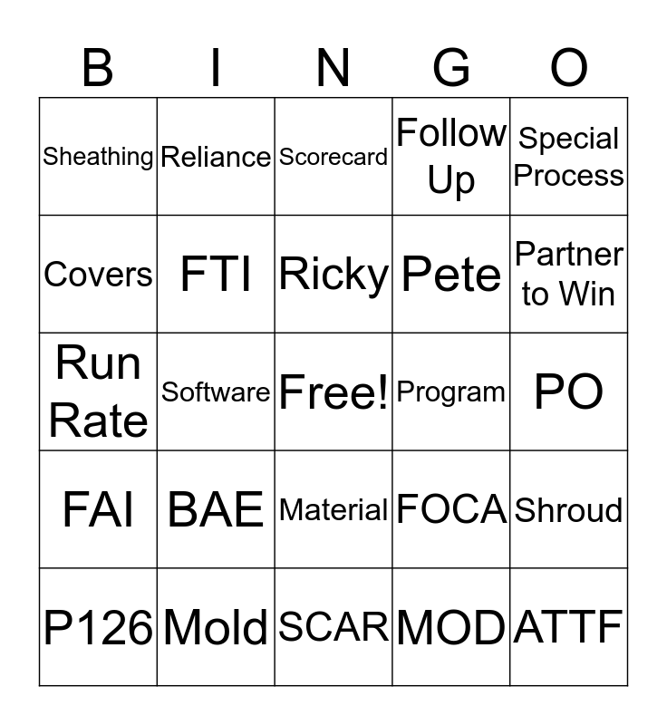 This bingo card has a free space and 28 words: Shroud, Relay Housing, Pete, MOD, Covers, Scorecard, Reliance, FAI, Program, P126, Run Rate, Follow Up, Mold, SCAR, Partner to Win, PRR, BAE, FTI, Ricky, Material, Sheathing, Fixtures, ATTF, Software, PO, FOCA, Special Process and Plating.