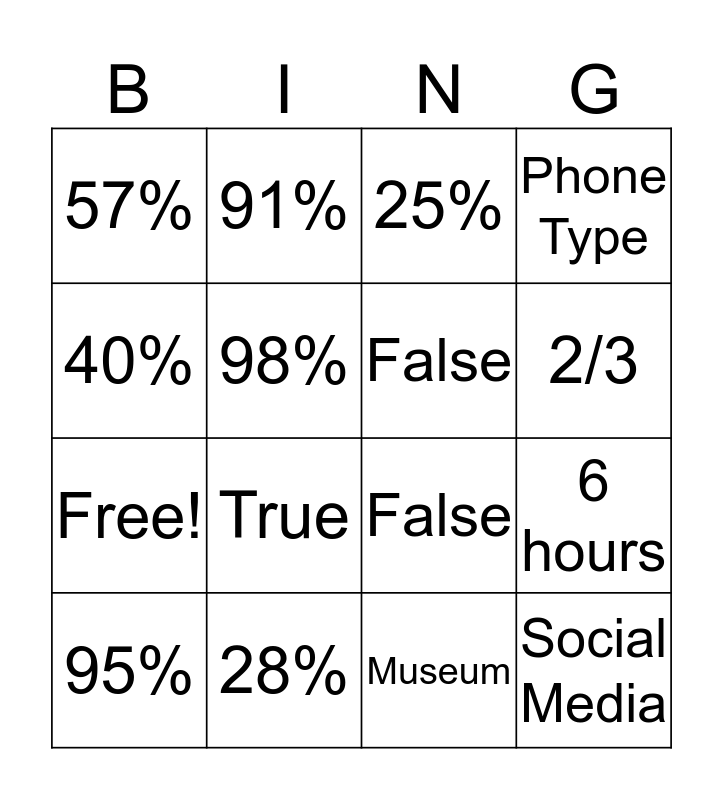 This bingo card has 20 words: 6 hours, 9 hours, 25%, 29%, 95%, 40%, 28%, 57%, Free!, 91%, True, False, 98%, Social Media, False, 2/3, 2/3, Phone Type, Museum and Limit Screen Time.