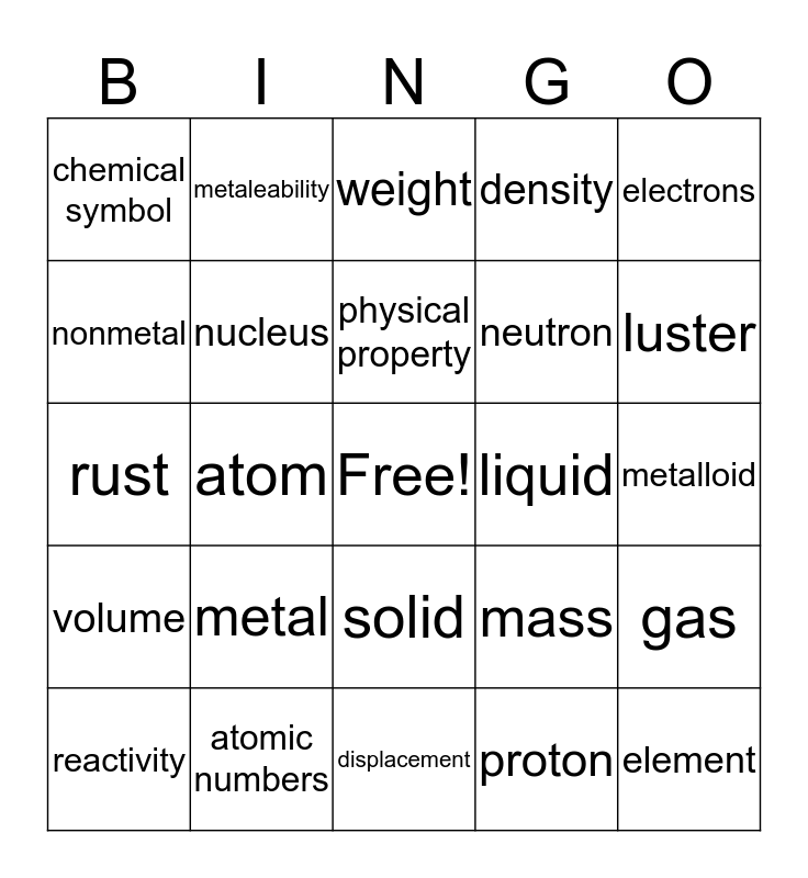 This bingo card has a free space and 24 words: metal, atomic numbers, physical property, reactivity, electrons, chemical symbol, nonmetal, metaleability, liquid, solid, neutron, rust, mass, gas, nucleus, proton, metalloid, weight, luster, atom, element, volume, density and displacement.