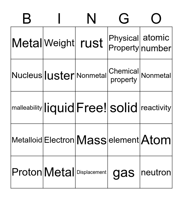 This bingo card has a free space and 24 words: Electron, Metal, Nonmetal, Proton, atomic number, Metal, Nucleus, Weight, solid, Mass, Chemical property, malleability, element, Atom, luster, gas, reactivity, rust, Nonmetal, liquid, neutron, Metalloid, Physical Property and Displacement.