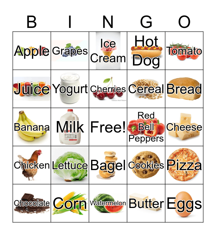 This bingo card has 24 images, a free space and 24 words: Lettuce, Corn, Cherries, Chocolate, Tomato, Apple, Juice, Grapes, Red Bell Peppers, Bagel, Cereal, Banana, Cookies, Pizza, Yogurt, Butter, Cheese, Ice Cream, Bread, Milk, Eggs, Chicken, Hot Dog and Watermelon.