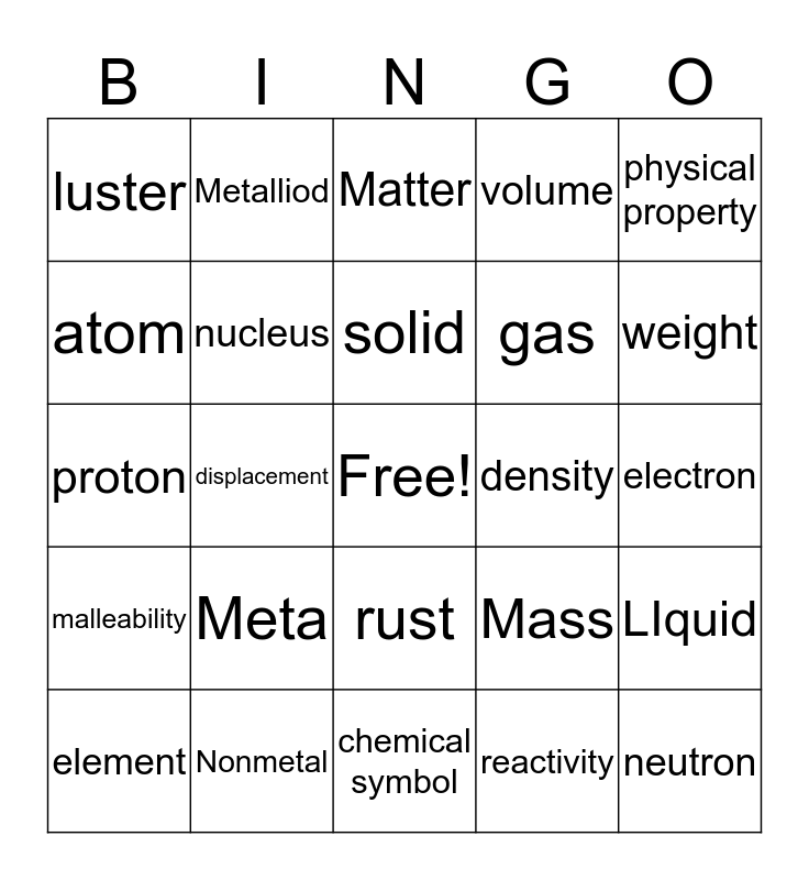 This bingo card has a free space and 24 words: Meta, Nonmetal, solid, element, physical property, luster, atom, Metalliod, density, rust, gas, proton, Mass, LIquid, nucleus, reactivity, electron, Matter, weight, displacement, neutron, malleability, volume and chemical symbol.