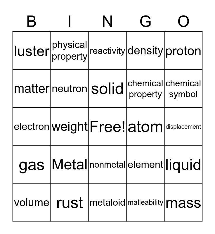 This bingo card has a free space and 24 words: Metal, rust, solid, volume, proton, luster, matter, physical property, atom, nonmetal, chemical property, electron, element, liquid, neutron, malleability, displacement, reactivity, chemical symbol, weight, mass, gas, density and metaloid.