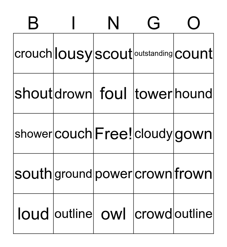This bingo card has a free space and 24 words: ground, outline, foul, loud, count, crouch, shout, lousy, cloudy, power, tower, shower, crown, frown, drown, crowd, gown, scout, hound, couch, outline, south, outstanding and owl.