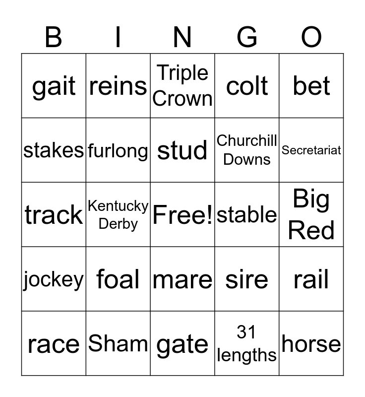 This bingo card has a free space and 29 words: race, backstretch, Kentucky Derby, stallion, gait, Triple Crown, furlong, foal, stable, Sham, Big Red, horse, gate, 31 lengths, Secretariat, trainer, mare, jockey, bet, track, sire, 2 lengths, Churchill Downs, stakes, colt, reins, rail, stud and breeding.