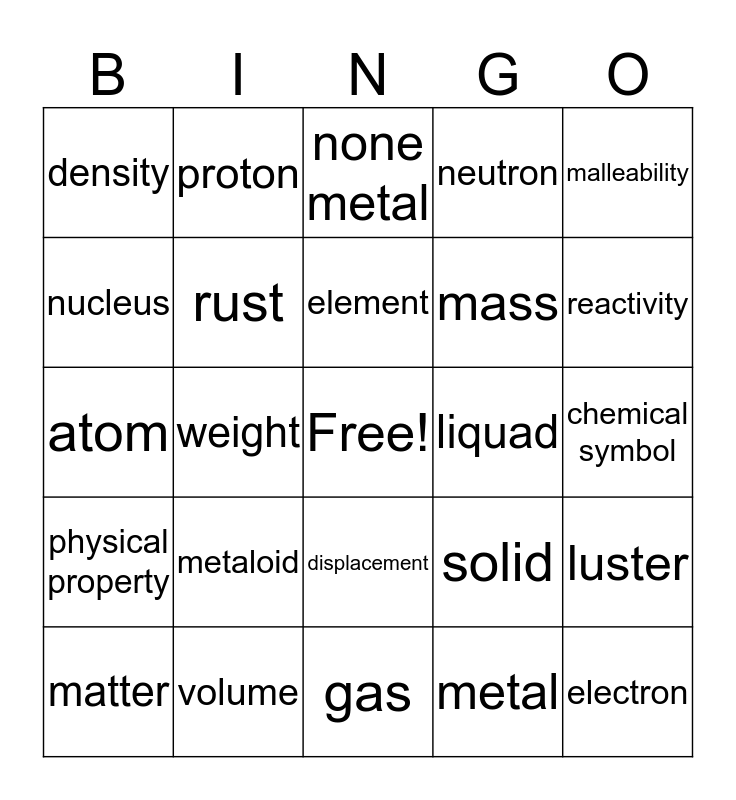 This bingo card has a free space and 24 words: matter, metaloid, element, metal, malleability, density, proton, none metal, liquad, chemical symbol, atom, rust, solid, luster, nucleus, volume, gas, neutron, reactivity, physical property, weight, displacement, mass and electron.