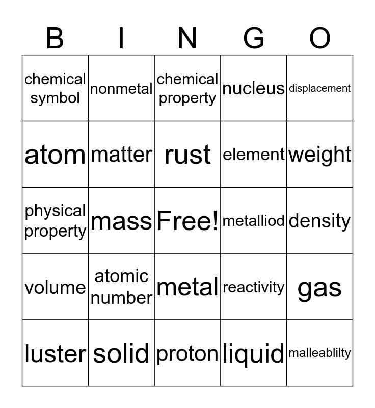 This bingo card has a free space and 24 words: atomic number, solid, rust, luster, displacement, chemical symbol, atom, nonmetal, metalliod, metal, element, physical property, reactivity, gas, matter, liquid, density, chemical property, weight, mass, malleablilty, volume, nucleus and proton.