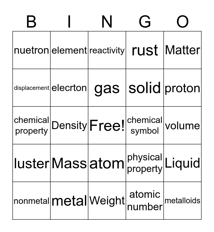 This bingo card has a free space and 24 words: Mass, metal, gas, nonmetal, Matter, nuetron, displacement, element, chemical symbol, atom, solid, chemical property, physical property, Liquid, elecrton, atomic number, volume, reactivity, proton, Density, metalloids, luster, rust and Weight.