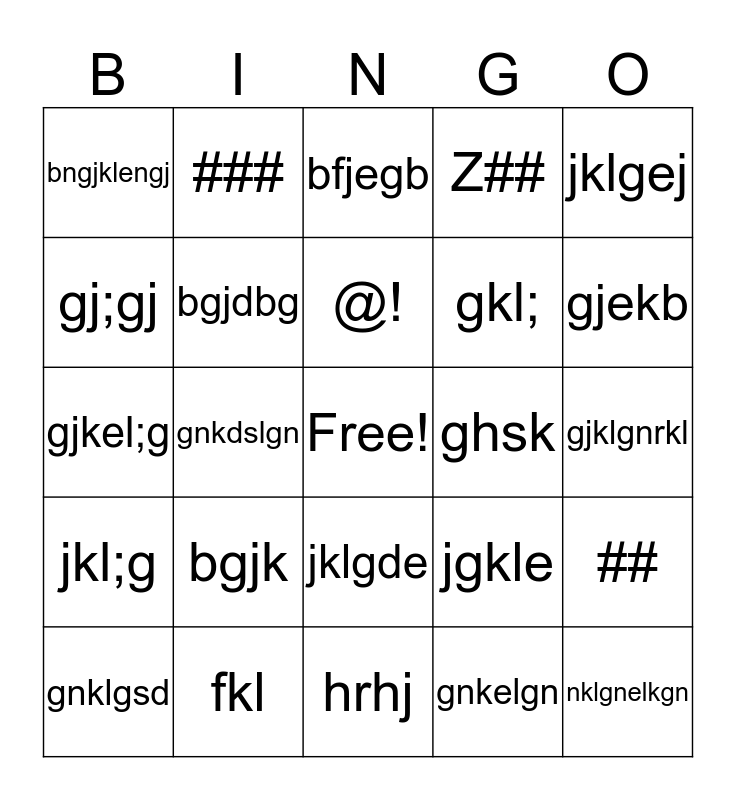 This bingo card has a free space and 29 words: gnklgsd, ngkdsl, gnkdslgn, ngklsdngjklng, bngjklengj, bfjegb, bgjdbg, bgjk, ghsk, fkl, gjklgnrkl, nklgnelkgn, hrhj, gnkelgn, gjekb, jfkwel, jklgde, jkl;g, jklgej, gjkel;g, jgkle, jgkld, gkl;, gj;gj, Z##, ###, ##, @! and 4y64.