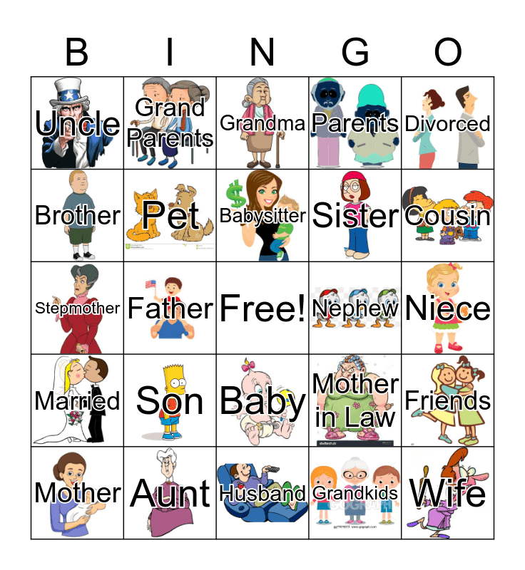 This bingo card has 29 images, a free space and 29 words: Mother, Grandpa, Father, Daughter, Uncle, Grandma, Pet, Son, Nephew, Aunt, Niece, Wife, Husband, Grandkids, Cousin, Stepfather, Baby, Married, Divorced, Stepmother, Mother in Law, Single, Sister, Brother, Parents, Grand Parents, Friends, Babysitter and Adopted Child.