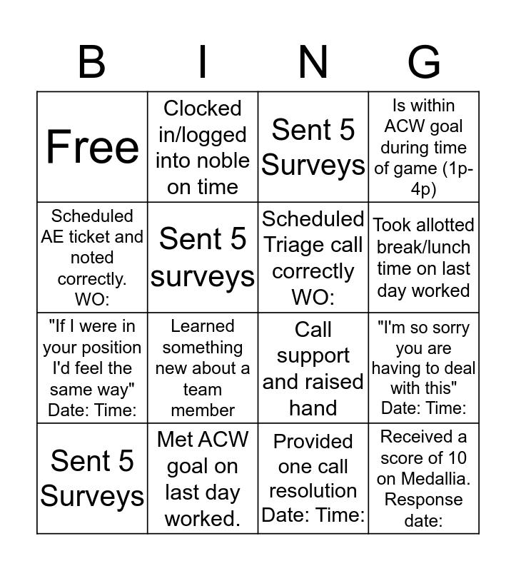This bingo card has 16 words: Met ACW goal on last day worked., "I'm so sorry you are having to deal with this" Date: Time:, Sent 5 Surveys, Free, "If I were in your position I'd feel the same way" Date: Time:, Clocked in/logged into noble on time, Call support and raised hand, Provided one call resolution Date: Time:, Scheduled AE ticket and noted correctly. WO:, Sent 5 surveys, Sent 5 Surveys, Is within ACW goal during time of game (1p-4p), Learned something new about a team member, Took allotted break/lunch time on last day worked, Scheduled Triage call correctly WO: and Received a score of 10 on Medallia. Response date:.