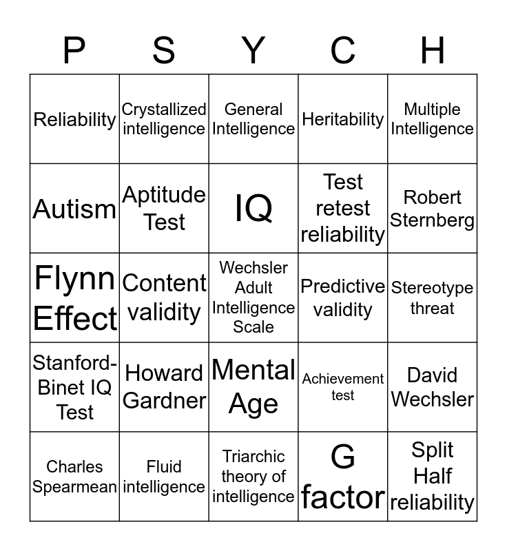 This bingo card has a free space and 29 words: Charles Spearmean, Savant Syndrome, Content validity, Standardization, Reliability, General Intelligence, Aptitude Test, Howard Gardner, Predictive validity, Fluid intelligence, Stereotype threat, Split Half reliability, Triarchic theory of intelligence, G factor, Robert Sternberg, Alfred Binet, Mental Age, Stanford- Binet IQ Test, Multiple Intelligence, Flynn Effect, Achievement test, Factor analysis, Test retest reliability, Autism, Heritability, Crystallized intelligence, David Wechsler, IQ and Intellectual disability.