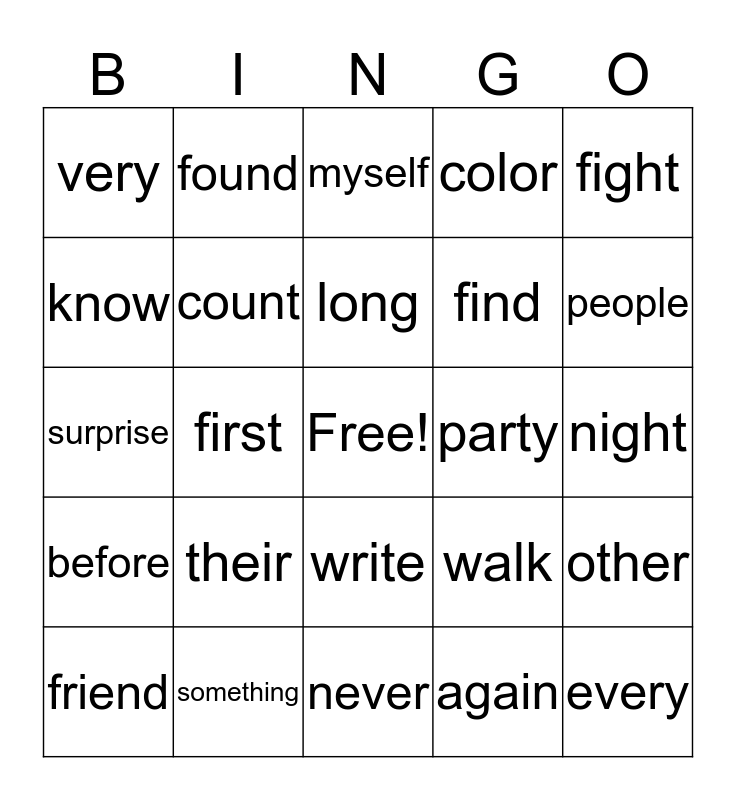 This bingo card has a free space and 34 words: after, again, beautiful, birthday, before, count, fight, friend, found, laugh, long, myself, own, might, party, people, something, surprise, their, walk, write, whose, very, night, never, every, color, buy, find, know, hello, first, other and another.