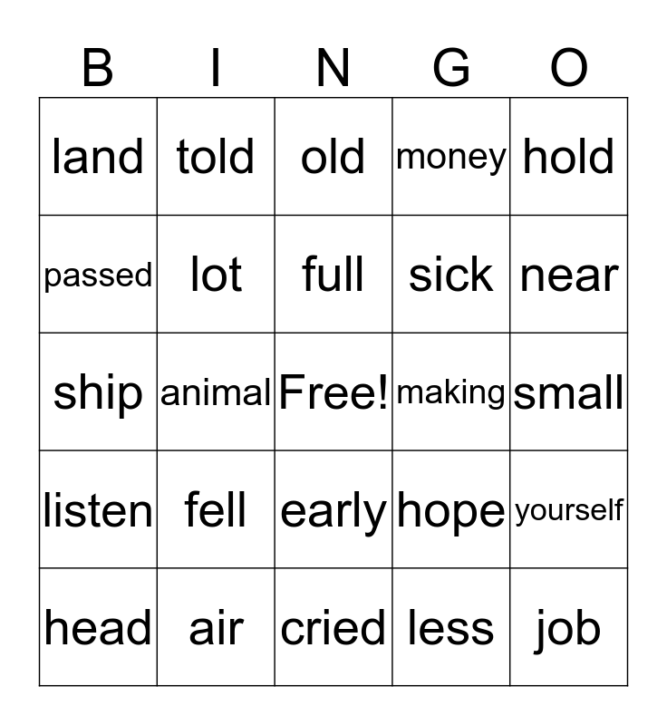 This bingo card has a free space and 24 words: fell, air, full, head, hold, land, passed, told, making, early, sick, ship, hope, yourself, lot, less, small, old, near, animal, job, listen, money and cried.