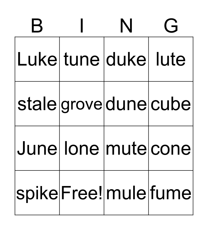 This bingo card has 21 words: Free!, u_e, tune, cute, mule, dune, Luke, duke, mute, cube, June, lute, fume, crime, grove, pride, spike, lone, stale, cone and froze.