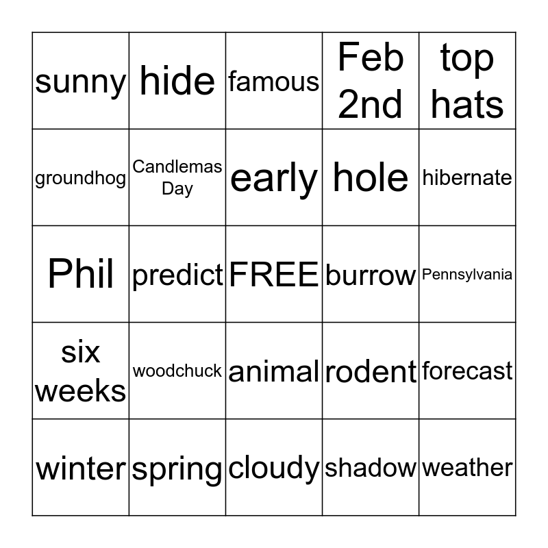 This bingo card has a free space and 24 words: woodchuck, spring, early, winter, top hats, sunny, groundhog, hide, burrow, animal, hole, Phil, rodent, forecast, Candlemas Day, shadow, Pennsylvania, famous, hibernate, predict, weather, six weeks, Feb 2nd and cloudy.