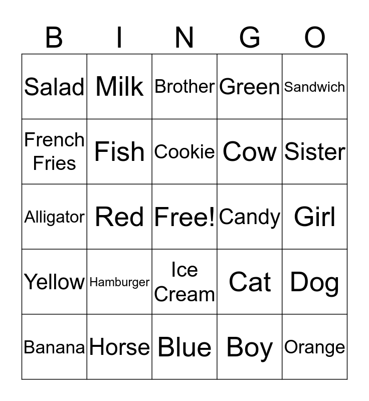 This bingo card has a free space and 24 words: Hamburger, Horse, Cookie, Banana, Sandwich, Salad, French Fries, Milk, Candy, Ice Cream, Cow, Alligator, Cat, Dog, Fish, Boy, Girl, Brother, Sister, Red, Orange, Yellow, Green and Blue.
