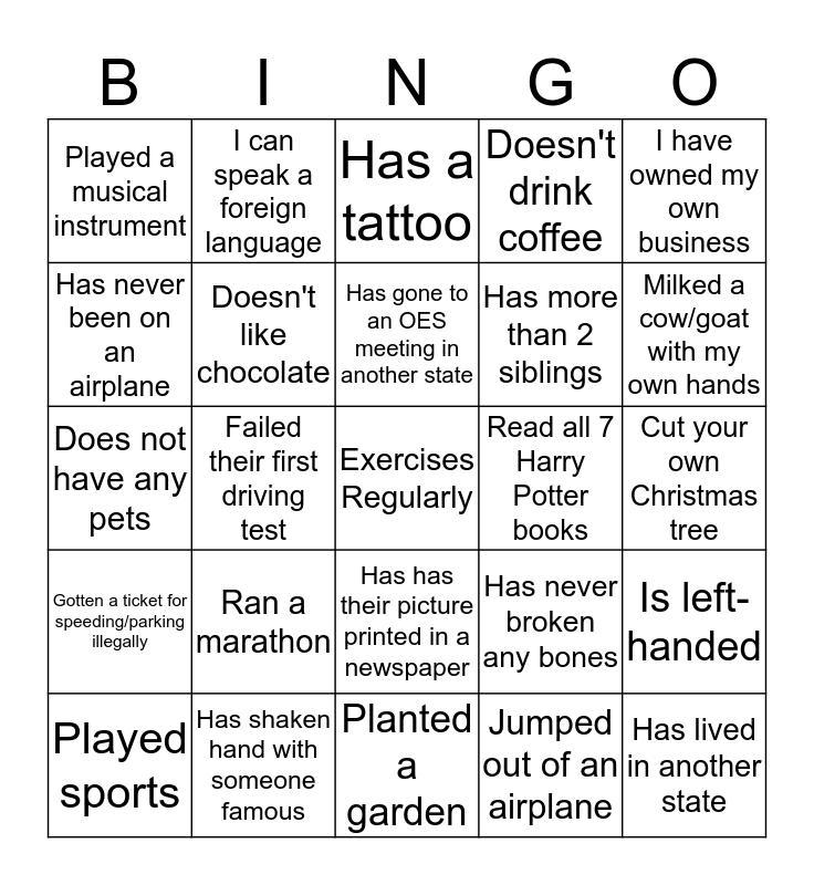 This bingo card has a free space and 29 words: Played sports, Has shot a gun, Failed their first driving test, Has changed a tire, Played a musical instrument, Has a tattoo, Doesn't like chocolate, Ran a marathon, Read all 7 Harry Potter books, Has shaken hand with someone famous, Cut your own Christmas tree, Has lived in another state, Planted a garden, Jumped out of an airplane, Milked a cow/goat with my own hands, Visited another continent, Has has their picture printed in a newspaper, Gotten a ticket for speeding/parking illegally, I have owned my own business, Does not have any pets, Has never broken any bones, Was in the Marching band, Has more than 2 siblings, Has never been on an airplane, Doesn't drink coffee, I can speak a foreign language, Is left-handed, Has gone to an OES meeting in another state and Swam in the ocean.