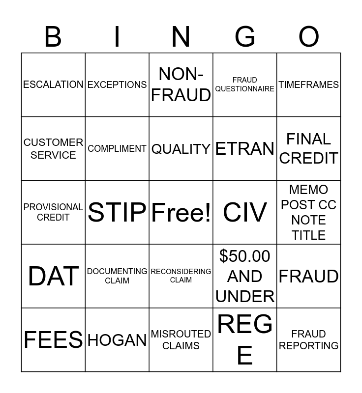 This bingo card has a free space and 34 words: SPLENDID, MEMO POST, MERCHANT ISSUED CREDIT, CUSTOM LETTER, MEMO POST CC NOTE TITLE, CUSTOMER SERVICE, COMPLIMENT, MISROUTED CLAIMS, ETRAN, FRAUD REPORTING, PROVISIONAL CREDIT, EXCEPTIONS, REG E, AUTHENTICATION, DAT, STIP, RECONSIDERING CLAIM, CIV, FRAUD, FEES, HOGAN, ADJUSTING OD FEE COUNTER, FRAUD QUESTIONNAIRE, FINAL CREDIT, VALUE AND EMPATHY, DOCUMENTING CLAIM, NON-FRAUD, WITHDRAWAL, TIMEFRAMES, ESCALATION, TEAMWORK, QUALITY, $50.00 AND UNDER and GOALS.