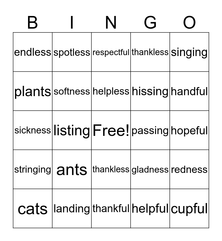 This bingo card has a free space and 24 words: ants, landing, helpless, cats, singing, endless, plants, spotless, passing, thankless, hissing, sickness, gladness, redness, softness, helpful, hopeful, respectful, handful, listing, cupful, stringing, thankless and thankful.