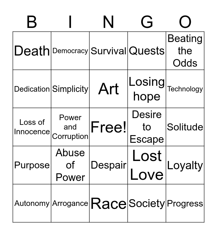 This bingo card has a free space and 24 words: Abuse of Power, Arrogance, Art, Autonomy, Beating the Odds, Death, Dedication, Democracy, Desire to Escape, Despair, Losing hope, Loss of Innocence, Lost Love, Loyalty, Simplicity, Society, Solitude, Survival, Technology, Power and Corruption, Progress, Purpose, Quests and Race.