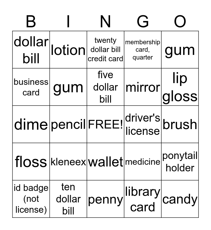 This bingo card has a free space and 31 words: penny, penny, pencil, pen, dollar bill, twenty dollar bill credit card, gum, medicine, driver's license, library card, brush, candy, bobby pin, notebook, lip gloss, make up kit, ponytail holder, kleneex, floss, wallet, gum, piece of jewelry, eyeshadow, id badge (not license), lotion, mirror, business card, membership card, quarter, dime, ten dollar bill, five dollar bill and receipt.